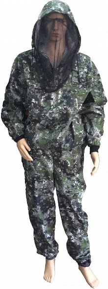 Костюм противоэнцефалитный. Куртка "Анорак", с горизонтальными складками-ловушками на полочке, спинке и рукавах куртки. В нижней части куртки подкладка, которая заправляется в брюки. Рукава с трикотажными манжетами. Противомоскитная сетка обеспечивает защиту от насекомых. На груди два прорезных кармана на молнии. Один карман под рацию и один карман на рукаве. Брюки свободного кроя на резинке, с двумя прорезными карманами. Пыльники внизу брюк, защищают от проникновения клеща.