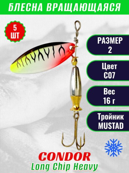 ➤ Какие характеристики у товара "Блесна вращающаяся Condor Long Chip Heavy размер 2 вес 16,0 г цвет C07 5шт"?
