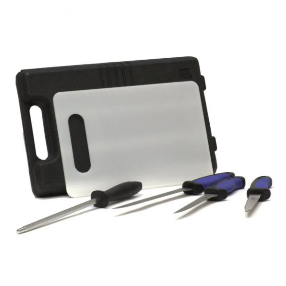 Представленный набор MT027 пригодится в длительных выездах, когда улов невозможно сохранить, а нужно сразу заготавливать. Он включает 5 предметов, каждый из которых надежно зафиксирован на своем месте в кейсе из ударопрочного пластика. Что именно входит в набор Mustad MT027? Во-первых, это разделочная доска, наделенная габаритами 29х19 см. Во-вторых, два филейных ножа. У них разные размеры: 28 и 32,5 см, чтобы можно было подобрать вариант под конкретный трофей. В-третьих, разработчики предусмотрели заточку, которой можно править инструмент при необходимости. В-четвертых, в комплекте есть небольшой рабочий нож. С одной стороны его лезвие в зазубринах, чтобы можно было чистить чешую, с другой - имеет качественную серрейторную заточку. Это позволяет резать твердые материалы, например, кости. Все клинки выполнены из нержавейки премиум класса. Каждая модель получила эргономичную, удобную рукоять с нескользящим покрытием. Для того, чтобы снизить риск травм, эта часть имеет упор для большого пальца, чтобы он случайно не соскользнул на лезвие.
